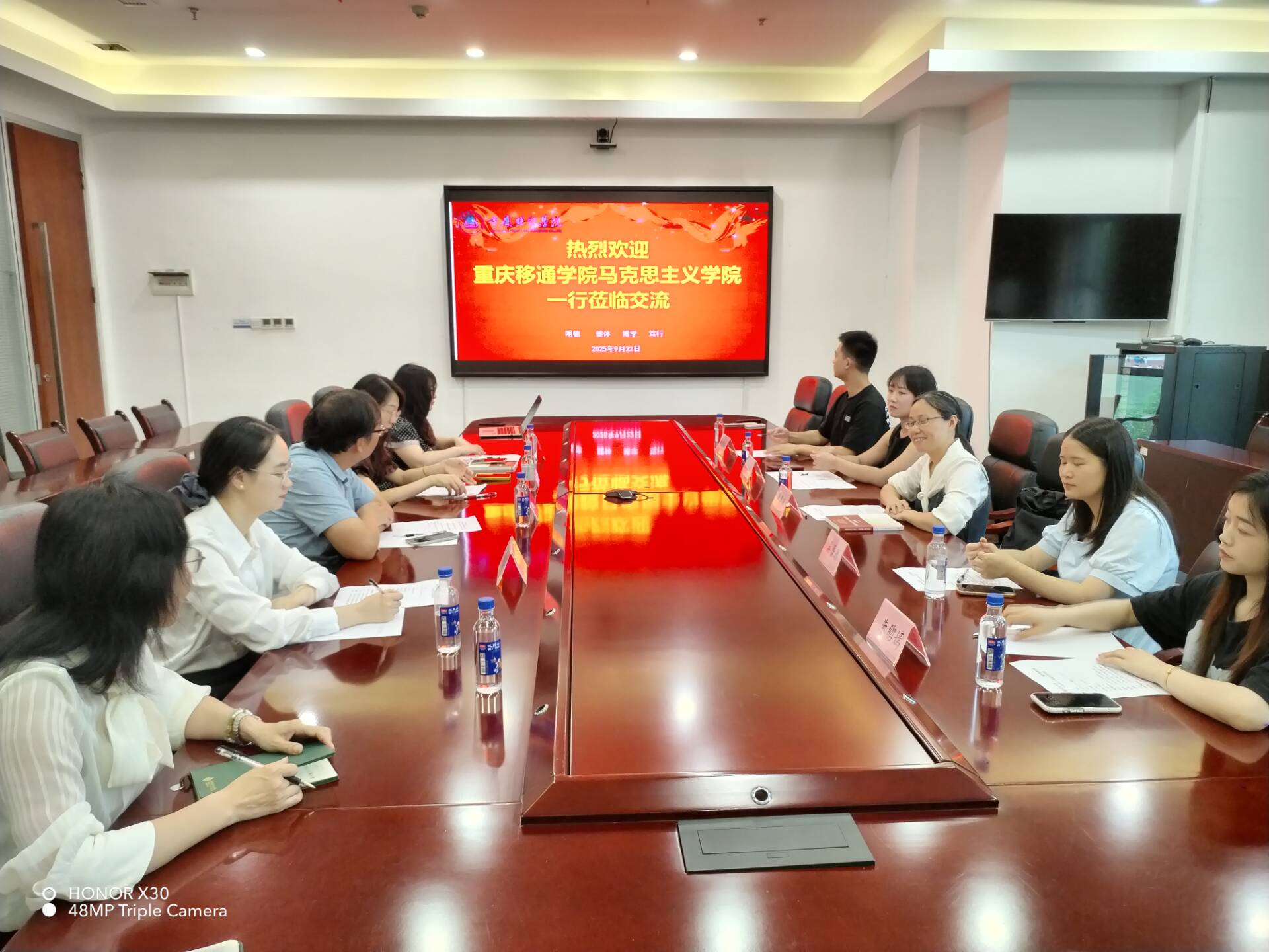 为加强马克思主义学院建设,促进“习近平新时代中国特色社会主义思想”(以下简称“习思想”)课程教学科研工作的互学互鉴,2025年9月22日下午3点,重庆财经学院马克思主义学院与重庆移通学院马克思主义学院在重庆财经学院行政楼2303会议室开展交流活动。重庆移通学院马克思主义学院副院长唐孝庆副教授带队,“习思想”教研室主任吴雪娇及邹国辉、朱脗嫣、杨天莹三位骨干教师参与;重庆财经学院马克思主义学院则由崔文卿副书记牵头,“习思想”教研室主任陈开江及王茂诗、刘璐静、李百灵三位骨干教师出席。刘璐静老师主持会议。