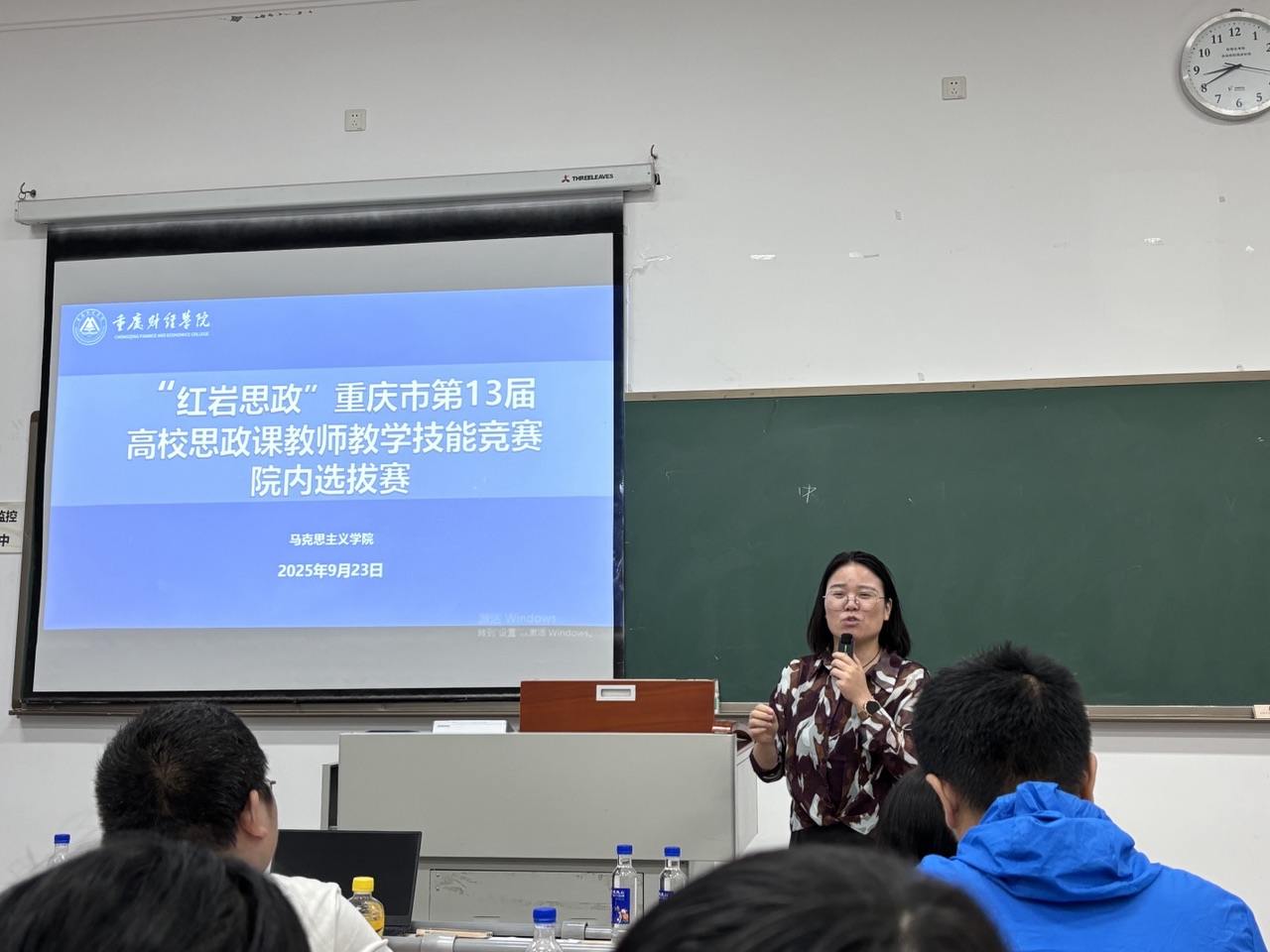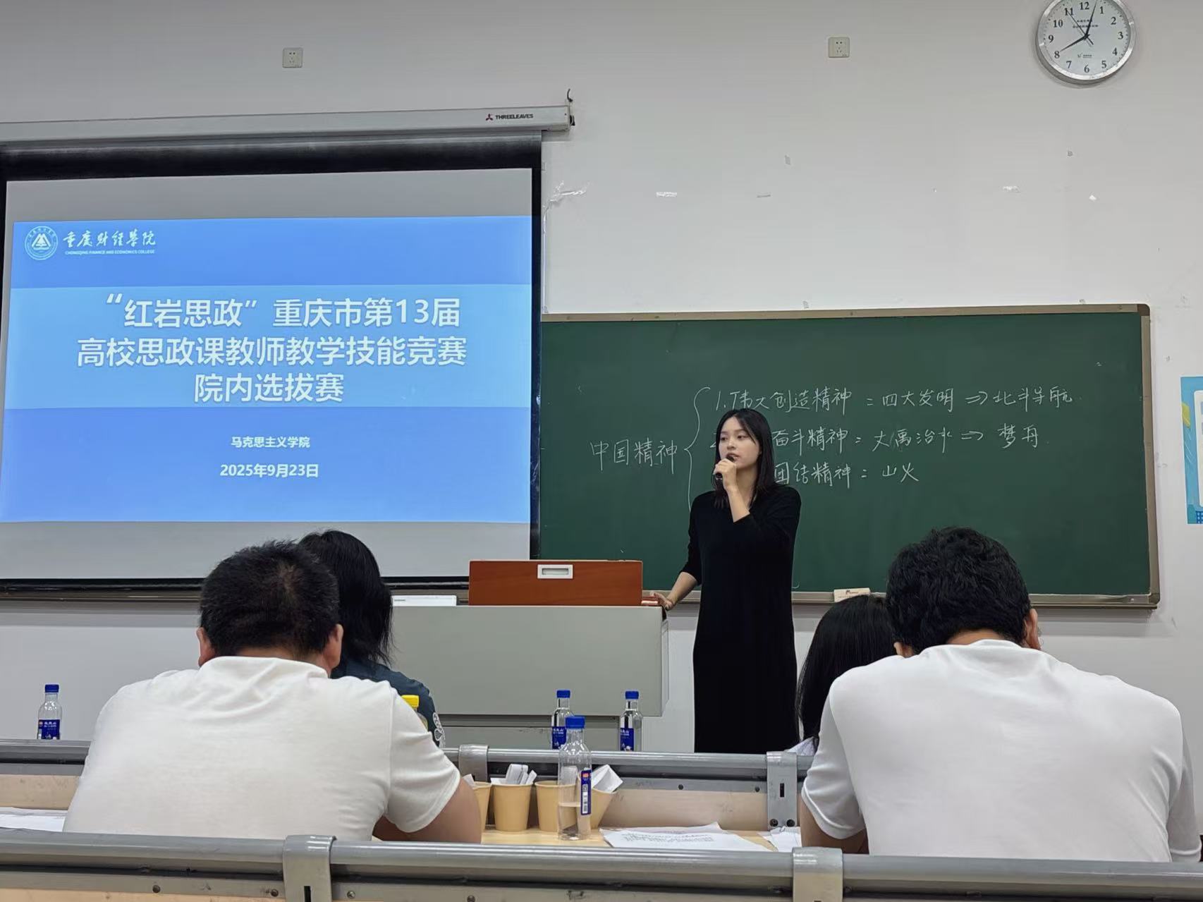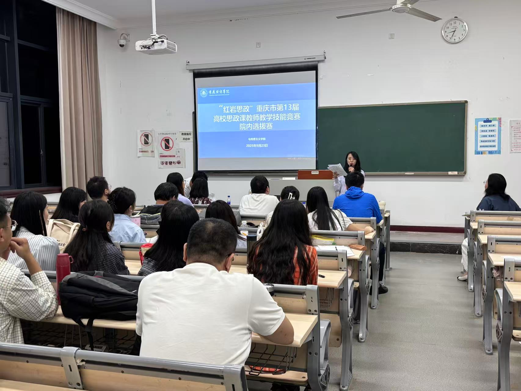 为深入学习贯彻党的二十大和二十届三中全会精神,贯彻落实习近平总书记在全国教育大会上的重要讲话以及关于学校思政课建设的重要指示精神,落实全市教育大会和新时代学校思政课建设推进会精神,以赛促训、以赛促学、以赛促学、以赛促教,着力建设一支政治强、情怀深、思维新、视野广、自律严、人格正的思政课教师队伍。9月23日,马克思主义学院在教学楼1523与1521同步举办了“红岩思政”重庆市第13届高校思政课教师教学技能竞赛校内初赛。本次比赛分为教师甲组和教师乙组,全体思政课专职教师参与,教务处副处长陈晴、马克思主义学院院长常晓薇、马克思主义学院党总支副书记崔文卿、副教授李佳以及各教研室主任担任本次比赛的评委。