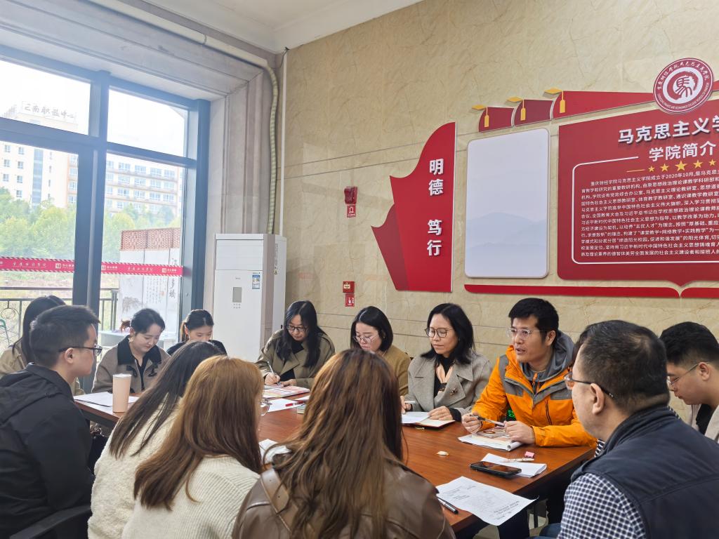为深学笃行二十届四中全会精神,贯彻落实《教育强国建设规划纲要(2024—2035年)》等有关文件精神,有序推进思想政治教育质量提升,发挥优秀教师的示范引领作用,马克思主义理论教研室于2025年11月3日上午9:00在1323教室集体观摩李百灵老师的《马克思主义基本原理》课程教学。课程观摩结束以后马克思主义理论教研室在马克思主义学院办公室进行了集中学习研讨。出席会议的人员有马克思主义学院院长常晓薇、教务处副处长陈晴、马克思主义学院党总支副书记兼教研室主任崔文卿以及教研室全体任课教师,会议由崔文卿主持。