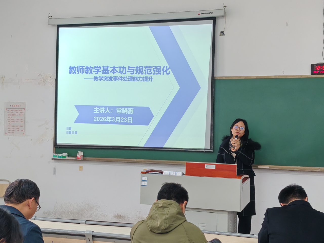 为进一步规范教学管理秩序、强化师德师风建设、筑牢教学安全防线,切实保障思政课育人工作平稳有序开展,2026年3月23日中午,马克思主义学院召开教学事故处理专题培训大会。学院院长常晓薇主讲本次培训,全体专任教师、教学管理人员参会学习。