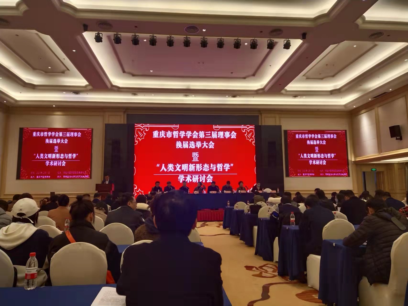 (马克思主义学院:常晓薇)2021年12月11日,在西南大学渝北校区维也纳酒店三楼一号会议厅,隆重召开了重庆哲学学会第三届换届选举大会暨“人类文明新形态与哲学”学术研讨会。本次会议由重庆市哲学学会主办、西南政法大学马克思主义学院承办,来自全市三十多所高校及科研机构的一百多位会员和代表与会。重庆市社科联、市民政局、西南政法大学的领导莅临指导。第二届会长、部分副会长、秘书长和常务理事出席了会议。我校马克思主义学院常晓薇院长和贺双艳老师应邀参了本次会议,并被推选为第三届理事会成员。
