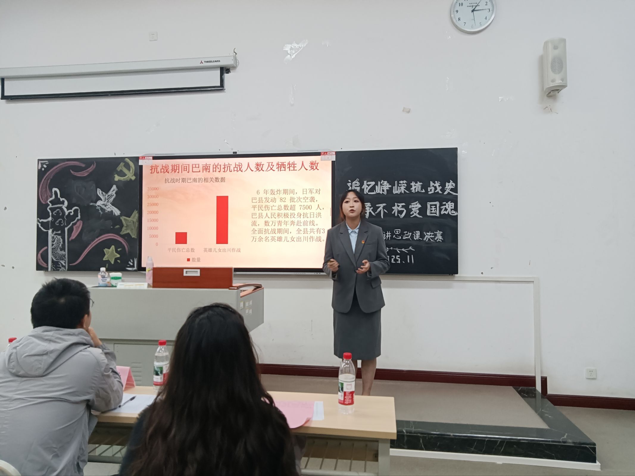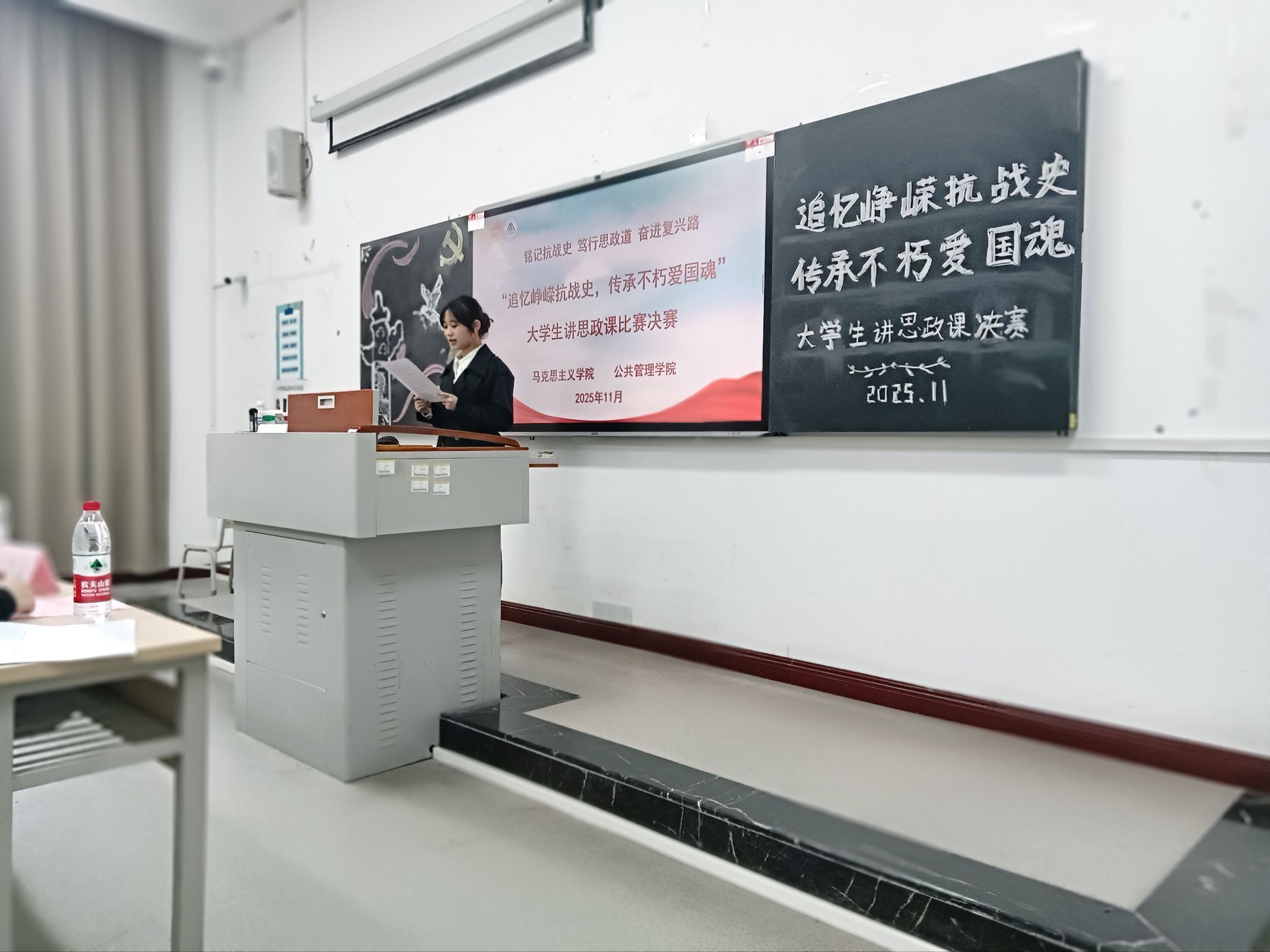 为深入学习贯彻习近平新时代中国特色社会主义思想,落实立德树人根本任务,充分发挥思想政治理论课在大学生思想政治教育中的主渠道作用,厚植青年爱国情怀,引导青年铭记抗战历史、传承红色基因,重庆财经学院第十三届“大思政课”铸魂育人系列活动之“追忆抗战峥嵘史,传承不朽爱国魂”大学生讲思政课比赛历经初赛、复赛的层层选拔,于2025年11月10日圆满完成决赛阶段比拼。