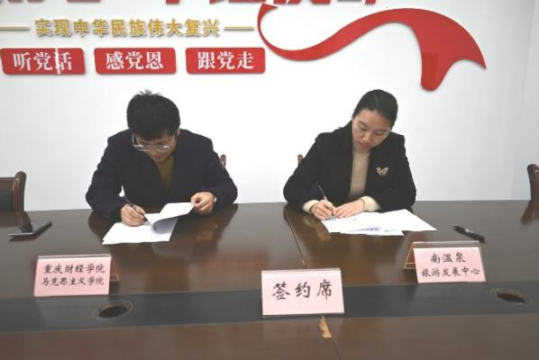参观活动结束后,馆校共建签约仪式在南温泉旅游服务中心办公室举行。重庆财经学院马克思学院崔文卿书记、陈开江老师、高雪莲主任等和重庆巴南区南温泉旅游服务中心主任李洪亮、副主任代源等代表出席仪式。双方围绕将南温泉解放重庆主战场遗址打造成为“大思政课”实践教学基地、推进“三下乡”活动等内容,展开深入交流并达成了共识,而后双方举行了馆校共建签约仪式。